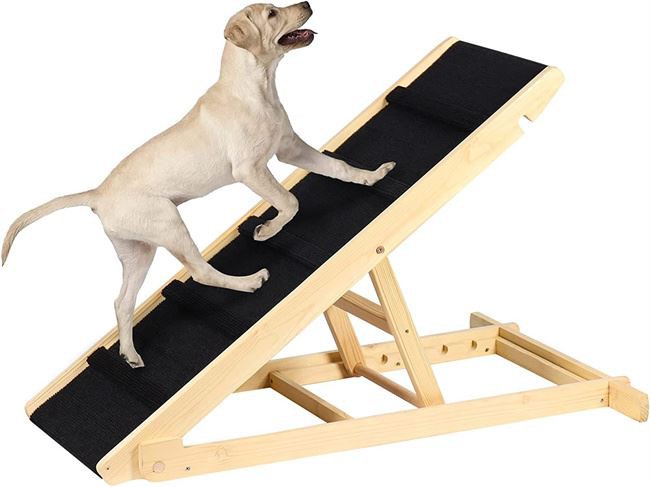 ·Öruggur og traustur rampur: Gerður úr úrvals viðarramma og 5 auka viðarræmum, þessi gæludýrastigi veitir sterkan stuðning og viðheldur nægum stöðugleika til að veita gæludýrinu þínu örugga klifurupplifun. Dragðu úr ótta á áhrifaríkan hátt og tryggðu að fullu öryggi gæludýrsins þíns við notkun.